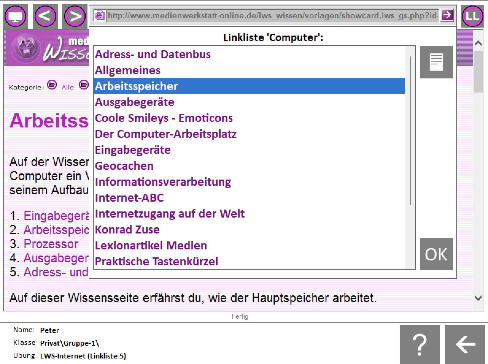Gezieltes Aufrufen von Wissensseiten Die Wissensseiten sind sowohl thematisch als auch alphabetisch sortiert, so dass ein schnelles Finden der gewünschten Information gewährleistet ist. In den unteren Jahrgangsstufen ist die Recherche- und Lesekompetenz jedoch noch nicht so stark ausgeprägt, so dass es sinnvoll ist, den Kindern nicht sofort alle Wissensseiten zur Verfügung zu stellen, sondern eben nur diejenigen, welche im laufenden Unterricht von thematischem Belang sind. Mit der Lernwerkstatt kann eine solche Auswahl der Wissensseiten getroffen werden. Die Kinder können somit zielgerichtet nach Informationen suchen und schrittweise an umfangreichere Seitenbestände herangeführt werden, um auf diese Weise die Recherchekompetenz der Kinder zunehmend zu fördern.